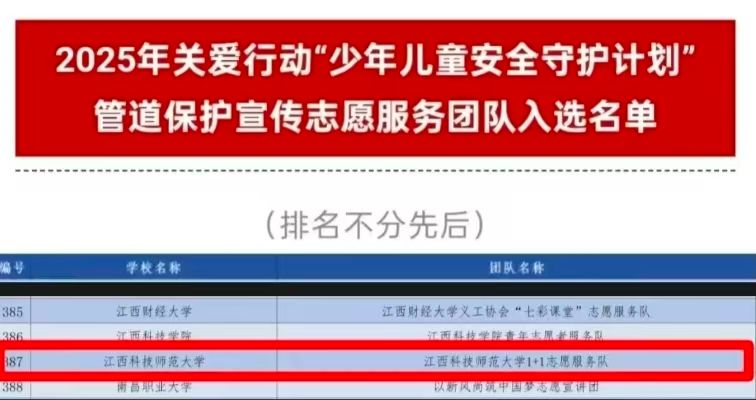 近日,由团中央青年志愿者行动指导中心、中国少年儿童新闻出版总社有限公司联合国家石油天然气管网集团有限公司共同发布了《关于遴选2025年关爱行动“少年儿童安全守护计划”管道保护宣传志愿服务团队的公告》,全国众多高校积极响应参与,我校江西科技师范大学 1+1 志愿服务队从中脱颖而出。成功进入2025年关爱行动“少年儿童安全守护计划”管道保护宣传志愿服务团队名单,展现了科技师大学子的卓越风采。