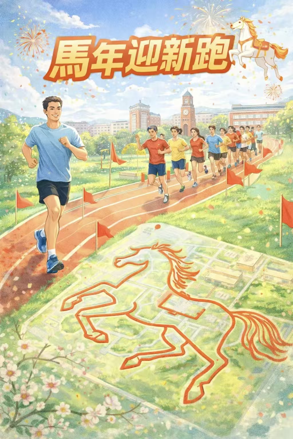 本次活动以“马年”为文化切入点,创新融合“马拉松”与“骏马意象”,赋予传统跑步活动更深层的文化寓意。前期筹备过程中,学生社团成员基于校园卫星地图反复推演路线设计,将“奔马”形态转化为实际可行的跑步轨迹,并不断优化调整,力求在安全与趣味之间取得平衡。