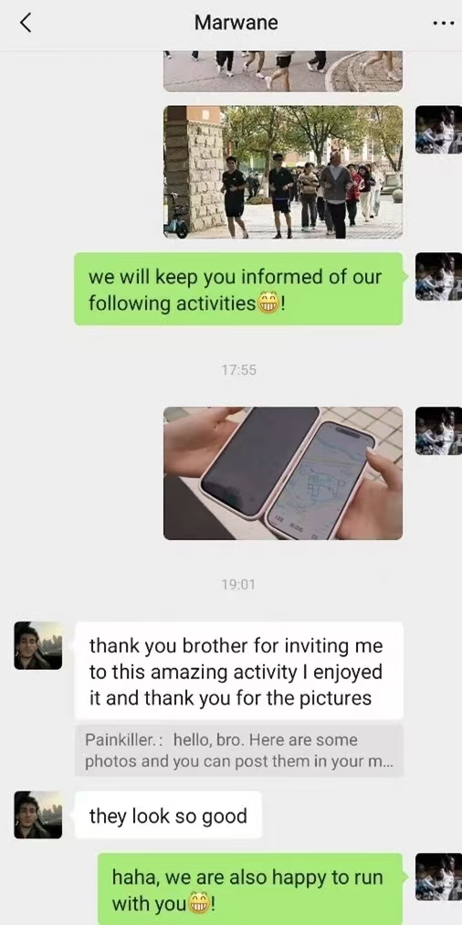活动过程中,同学们通过运动软件记录轨迹,并在活动结束后积极分享成果与感受,“形式新颖”“体验感强”等评价频频出现。此外,一名摩洛哥留学生的参与也为活动增添亮点。他在体验跑步乐趣的同时,加深了对中华文化的理解,体现了活动以体育为桥梁,促进中外交流的积极意义。