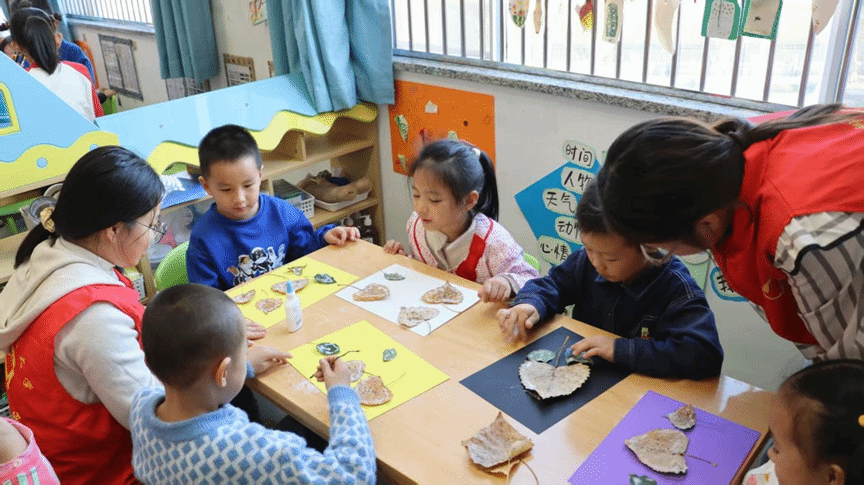 霜降折纸小树环节点燃全场:在志愿者的悉心引导下,孩子们用斑斓的秋叶创作一幅幅饱含童真的作品。欢声笑语中,孩子们自豪地向老师展示成果,每一处细节都跃动着对霜降时节的诗意感知。
