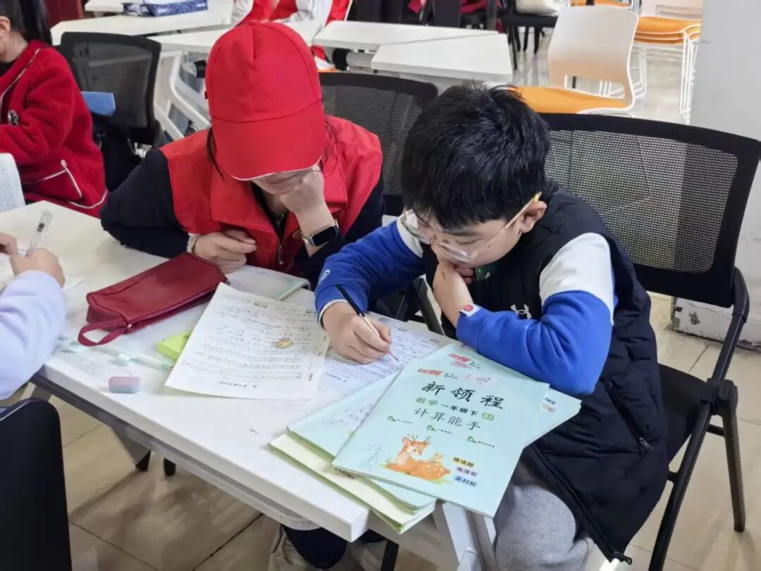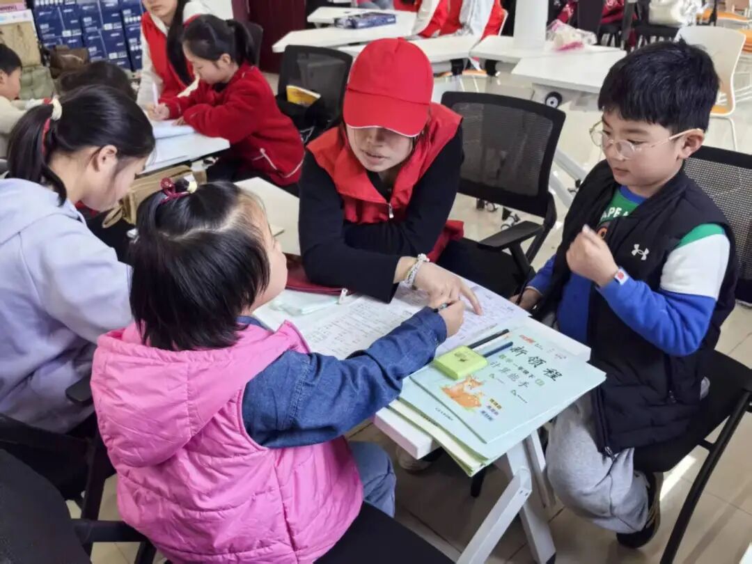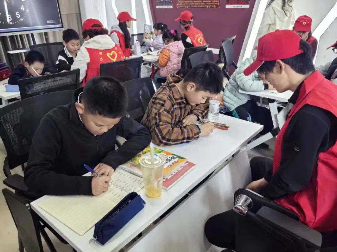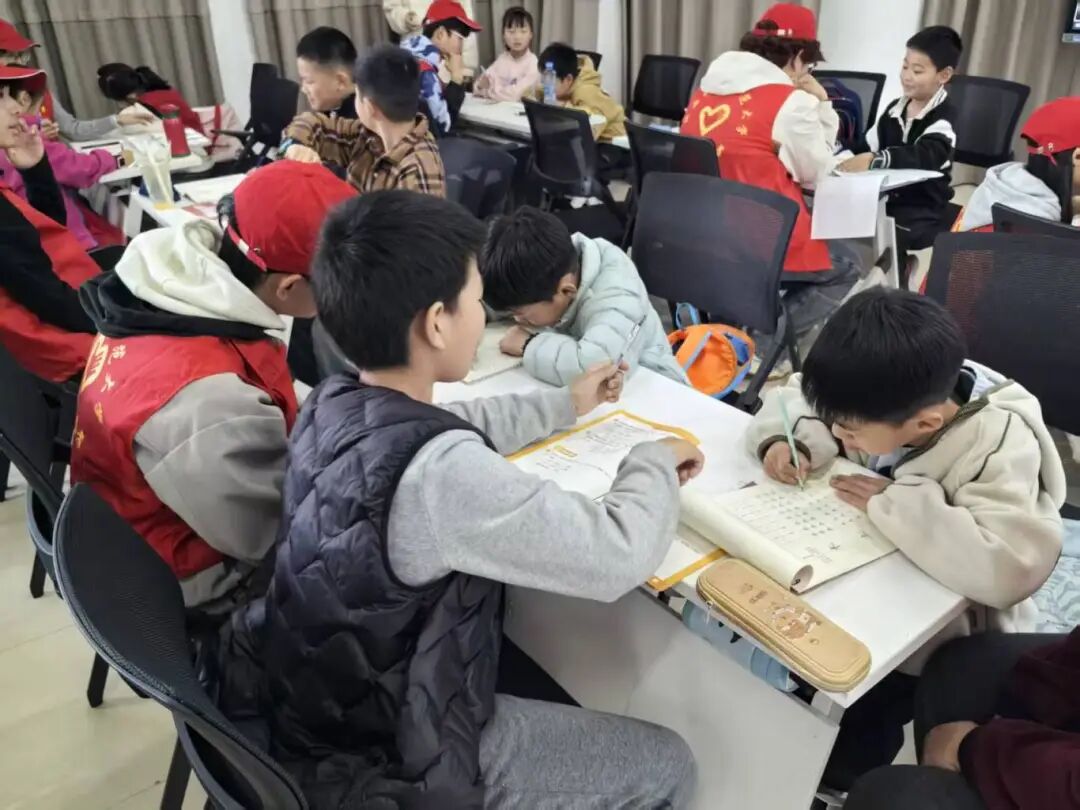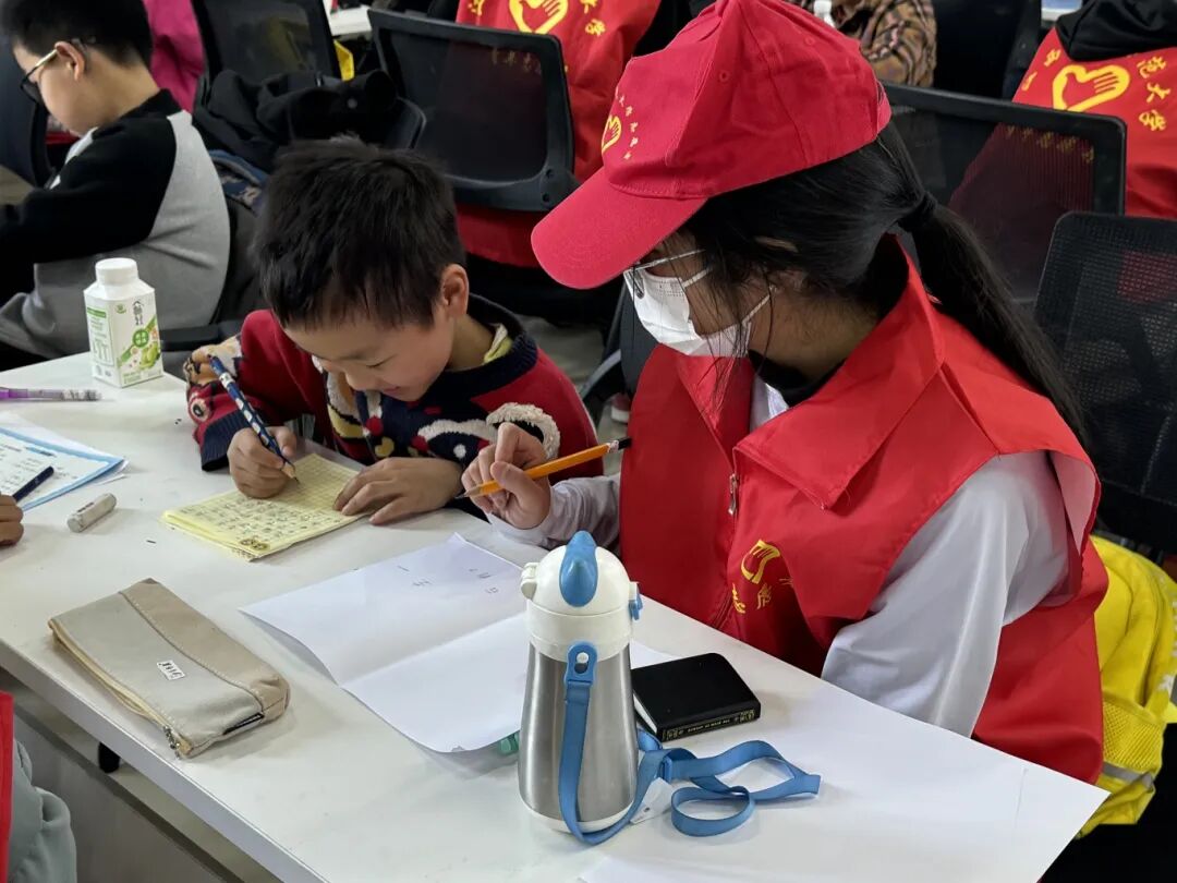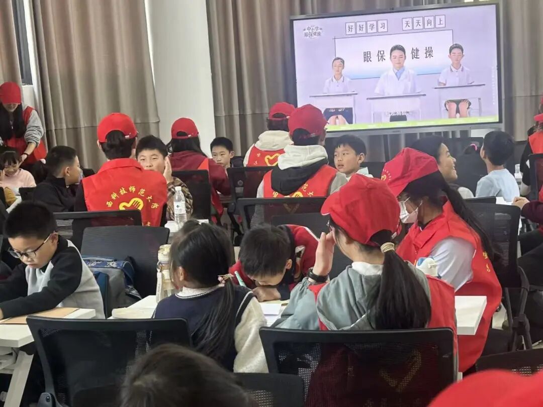 活动伊始,志愿者们化身“小老师”,以一名志愿者带领两名小朋友的小组模式开展作业辅导,耐心答疑解惑,高效助力孩子们完成周末作业,同时也为忙碌的教职工家长们分担了压力。作业辅导结束后,伴随着舒缓的音乐,孩子们在志愿者的带领下认真做起眼保健操,通过规范动作呵护视力,在细节中传递着温暖的关爱与健康理念。