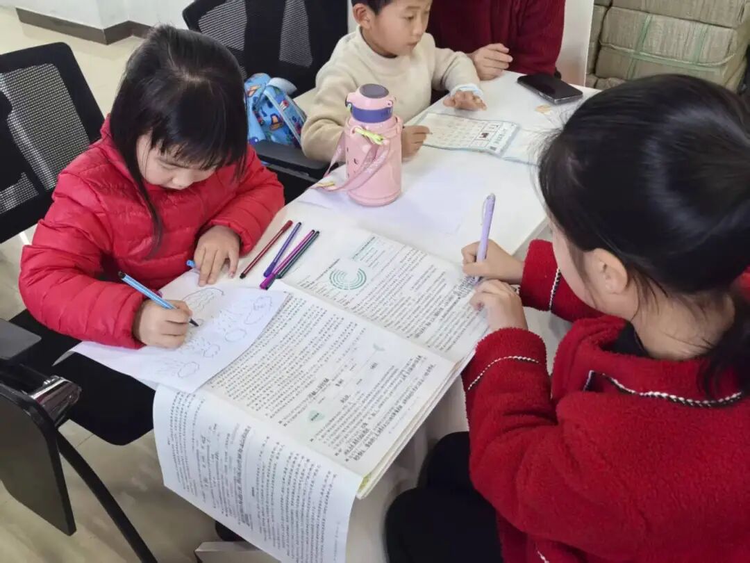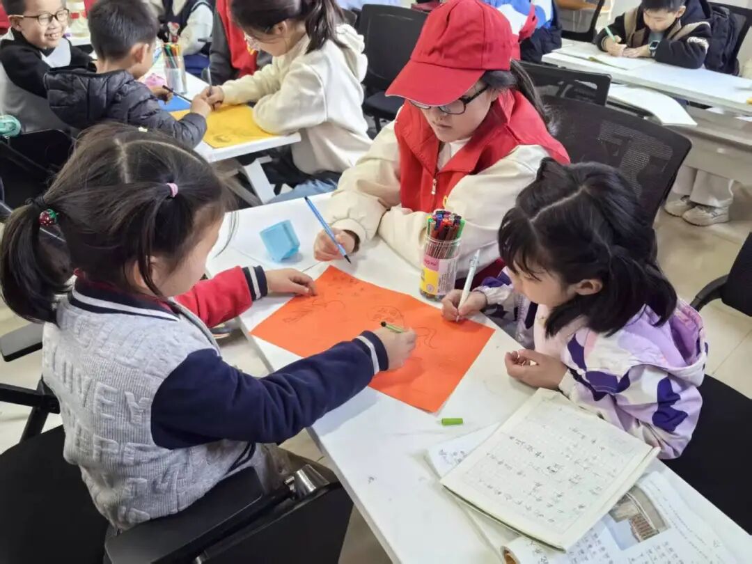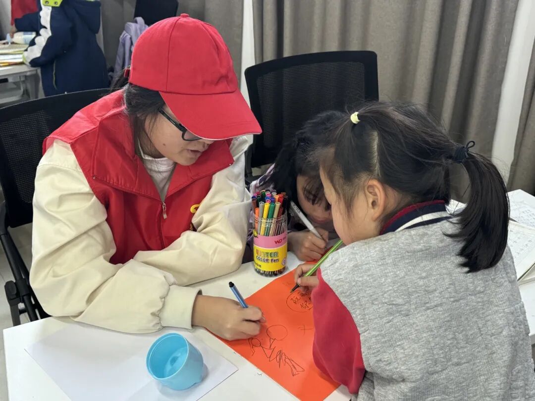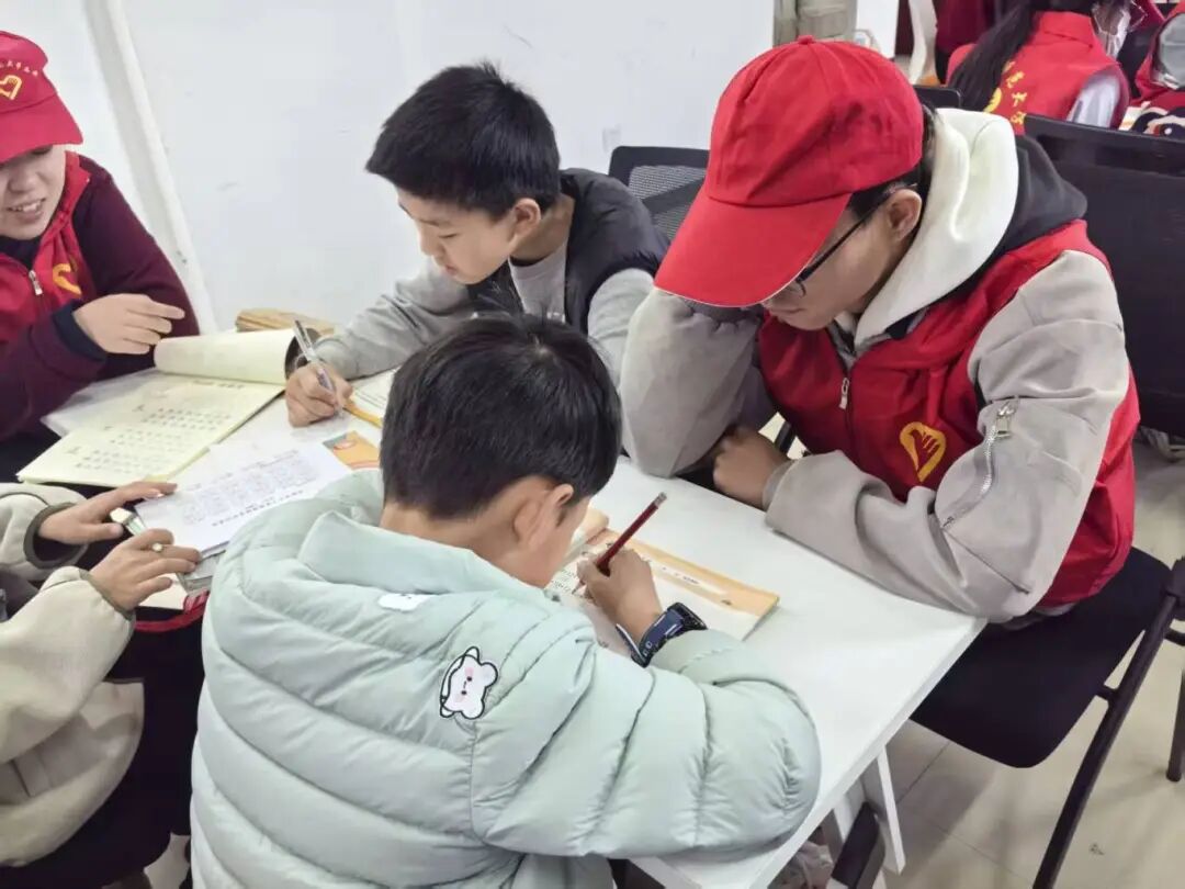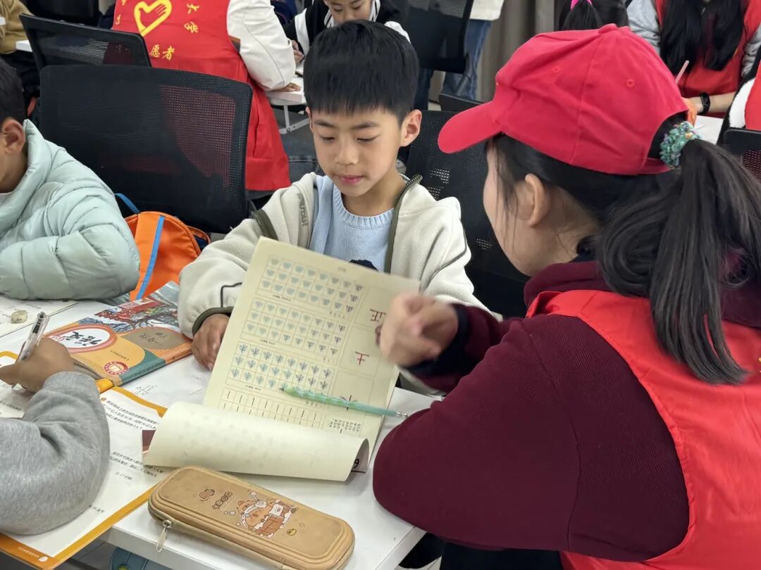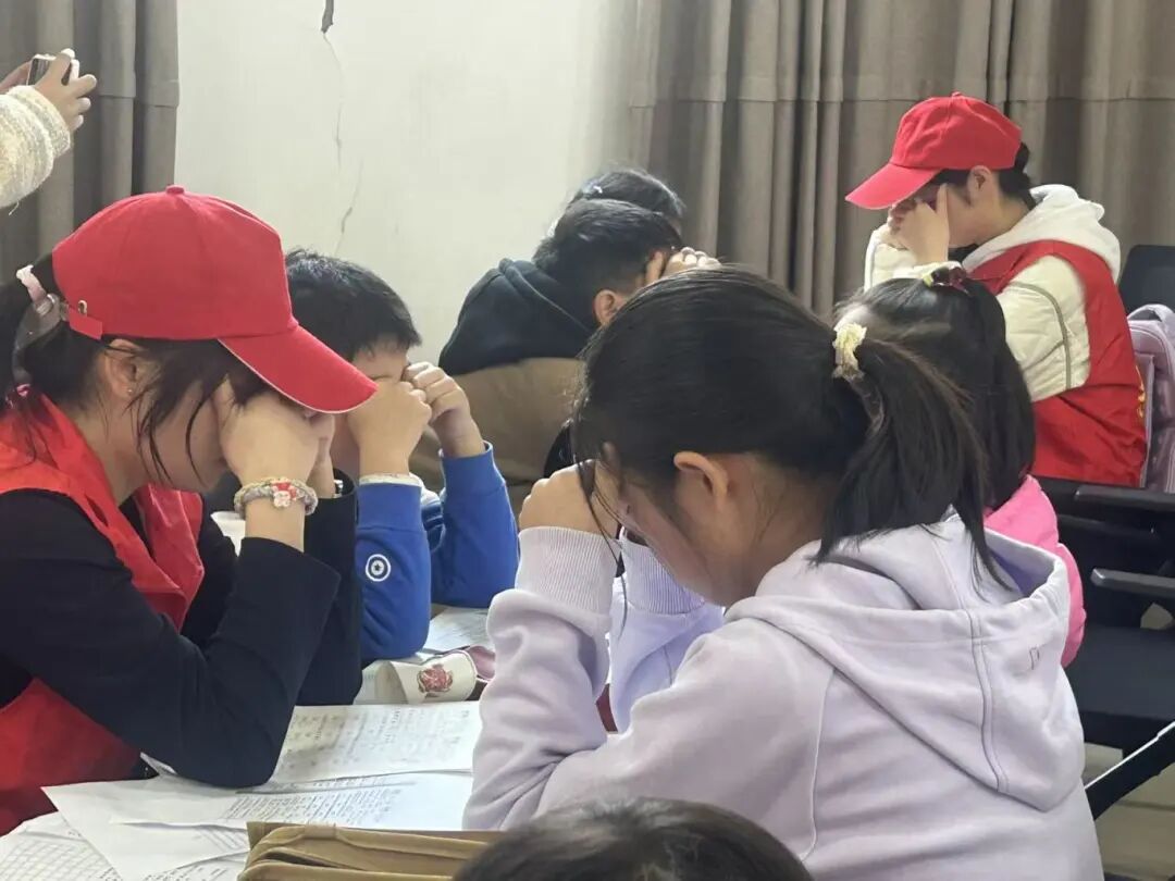 活动伊始,志愿者们化身“小老师”,以一名志愿者带领两名小朋友的小组模式开展作业辅导,耐心答疑解惑,高效助力孩子们完成周末作业,同时也为忙碌的教职工家长们分担了压力。作业辅导结束后,伴随着舒缓的音乐,孩子们在志愿者的带领下认真做起眼保健操,通过规范动作呵护视力,在细节中传递着温暖的关爱与健康理念。