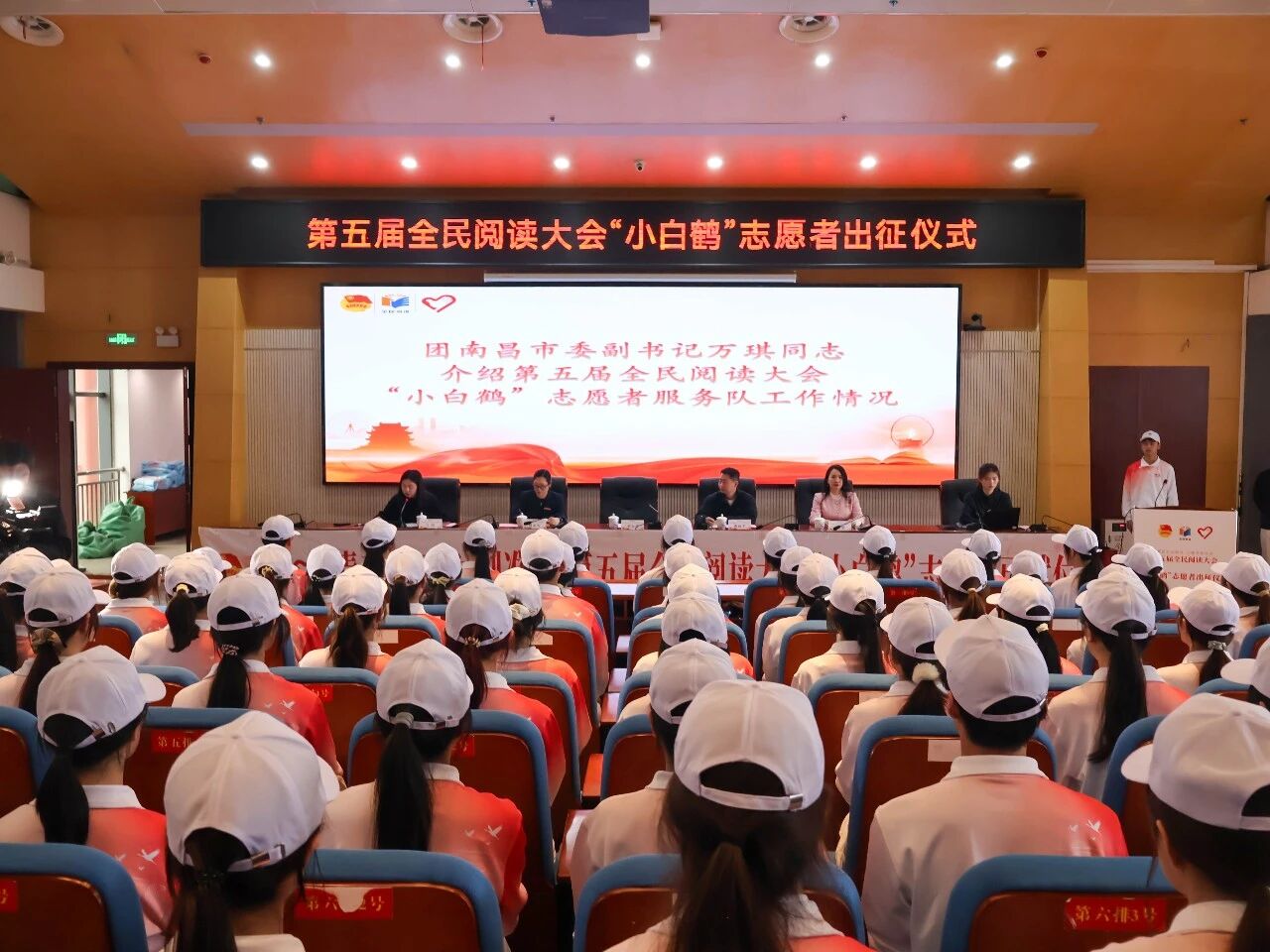 为全力服务保障第五届全民阅读大会顺利召开,擦亮南昌书香城市名片,展示英雄城文明风貌,传承弘扬“奉献、友爱、互助、进步”的志愿精神,4月17日下午15:30,第五届全民阅读大会志愿者出征仪式在江西科技师范大学红角洲校区图书馆950报告厅隆重举行。团南昌市委书记刘众星、副书记万琪,南昌大学团委副书记熊成军,江西旅游商贸职业学院团委书记戴婧,江西科技师范大学团委副书记周晏悦出席活动,350余名志愿者代表共同参与。