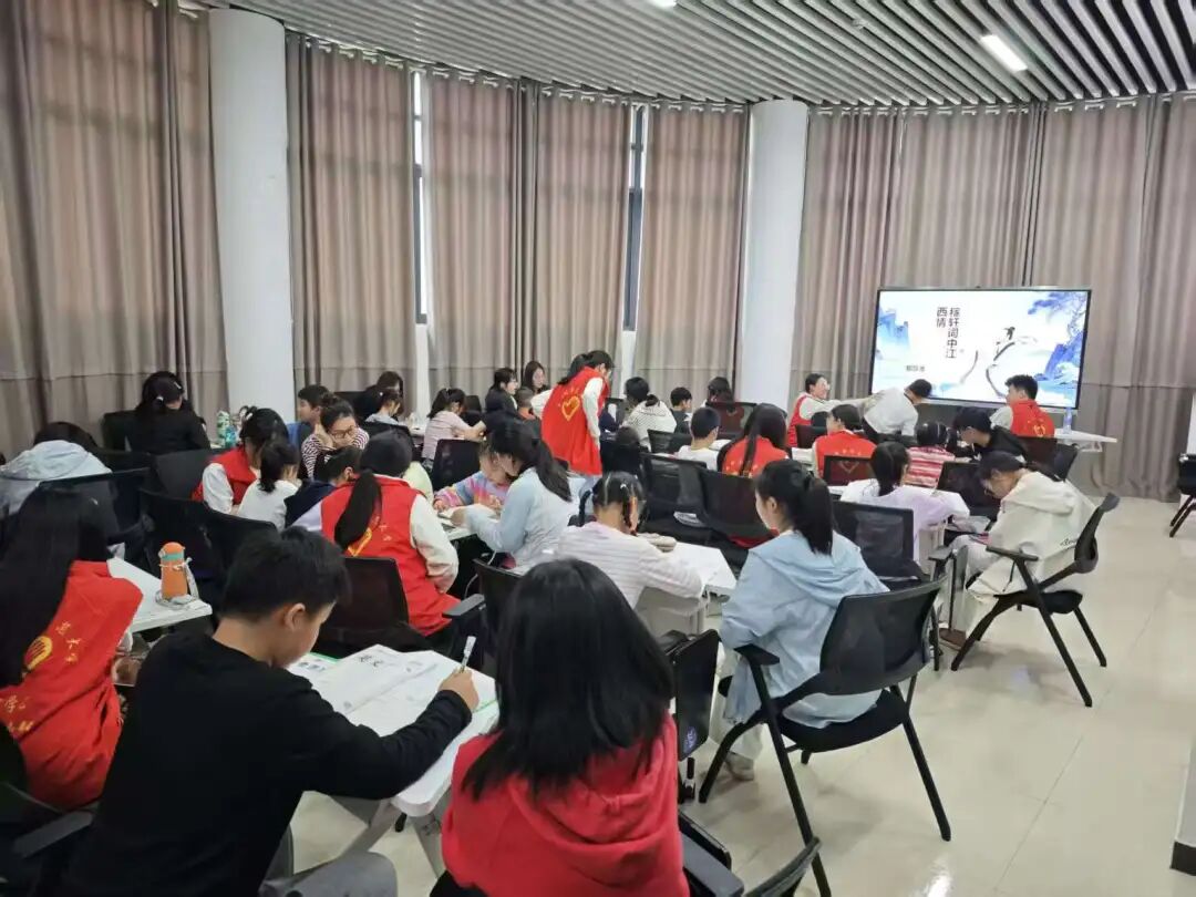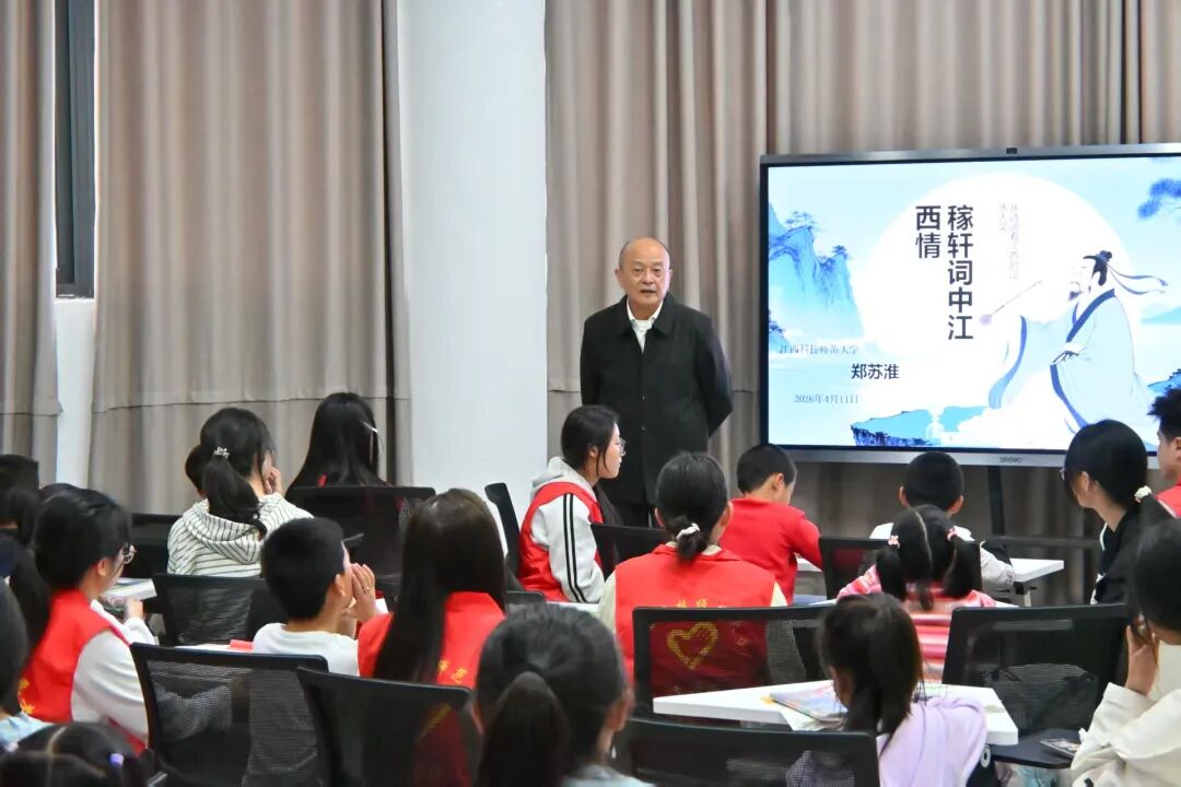 为持续深化实践育人成效,传承中华优秀传统文化,丰富校园文化生活,服务少年儿童健康成长,校团委打造的“小小课堂”品牌活动持续暖心开展。4月11日下午,文学院离退休教师、原院长郑苏淮走进课堂,以“稼轩词中江西情”为主题,带领孩子们品读辛弃疾经典词作,感受赣鄱山水人文魅力。活动将名师授课、诗词赏析、创意手工与趣味互动有机融合,让孩子们在诗词浸润中涵养心灵、快乐成长。